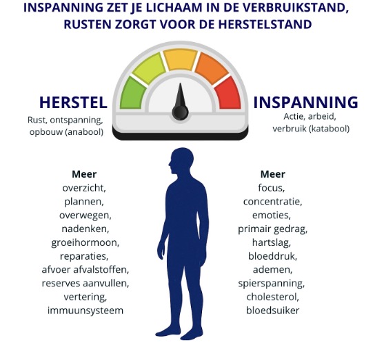 Iedereen ervaart stress. In de basis is dat gezond: het helpt je alert te zijn en te presteren. Wanneer stress te lang aanhoudt en herstel uitblijft, bouw je een hersteltekort op. Het zijn niet zozeer de stressreacties die bepalend zijn voor je gezondheid, maar de mate van herstel erna. Te weinig herstel kan het omslaan in klachten. Wat vaak begint met spanningssignalen zoals lichte vermoeidheid, milde slaapproblemen en piekeren. Als je niet ingrijpt worden de klachten steeds ernstiger. Slaapproblemen worden groter, vermoeidheid is de gehele dag sluimerend aanwezig, er is een gejaagd gevoel, piekeren is steeds meer aanwezig, uitvoeren van de gewone taken wordt steeds lastiger. Veel mensen zetten dan een tandje bij om toch te proberen goed te functioneren. Mensen putten zich dan fysiek en mentaal uit, ze plegen roofbouw op zichzelf. De chronische stress creëert een stapeling van fysieke en mentale klachten die eerst tot overspanning leiden en, als je niet voldoende bijstelt en herstelt, uiteindelijk een burn-out.
